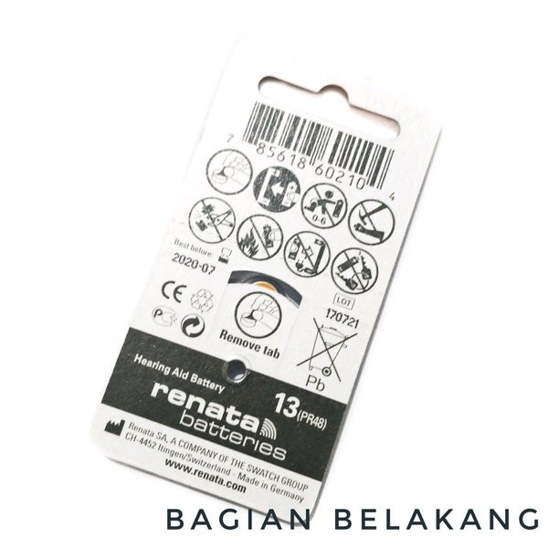 Hearing Aid Batteries RENATA 13 (PR48) MADE IN GERMANY. Baterai ini khusus dibuat untuk ALAT BANTU DENGAR / HEARING AID dengan ukuran baterai 13 ( Equivalen dengan AG5 atau A13)