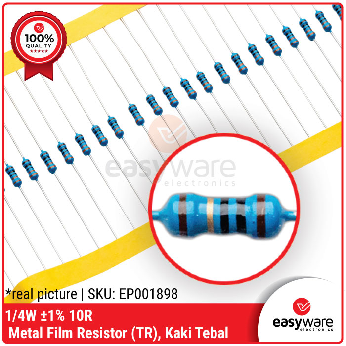 Spesifikasi: - Manufacturer: Made in Taiwan - Type: Metal Film Resistors - Resistance: 10 Ω - Tolerance: 1% - Wattage: 1/4W
