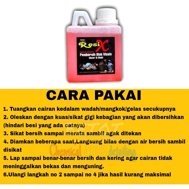 RESIX adalah cairan khusus pembersih BLOK MESIN/CRANKCASE ataupun ruang Mesin dengan maksimal. BENEFIT YANG DIDAPATKAN: * membersihkan ruang mesin dari kotoran, kerak, debu, endapan, lumpur, minyak, oli dll. * menghilangkan bekas minyak yg menempel pada ruang mesin * menghilangkan bekas oli yg menempel pada ruang mesin * membersihkan mesin dan velg yg kotor * melindungi dan merawat ruang mesin dari debu dan kotoran yg berlebih * menjadikan kondisi Mesin mobil dan motor selalu bersih dan terhindar dari kerak dan karat. * membersihkan kerak oli, kerak membandel, blok mesin yg berkerak, selang dll.