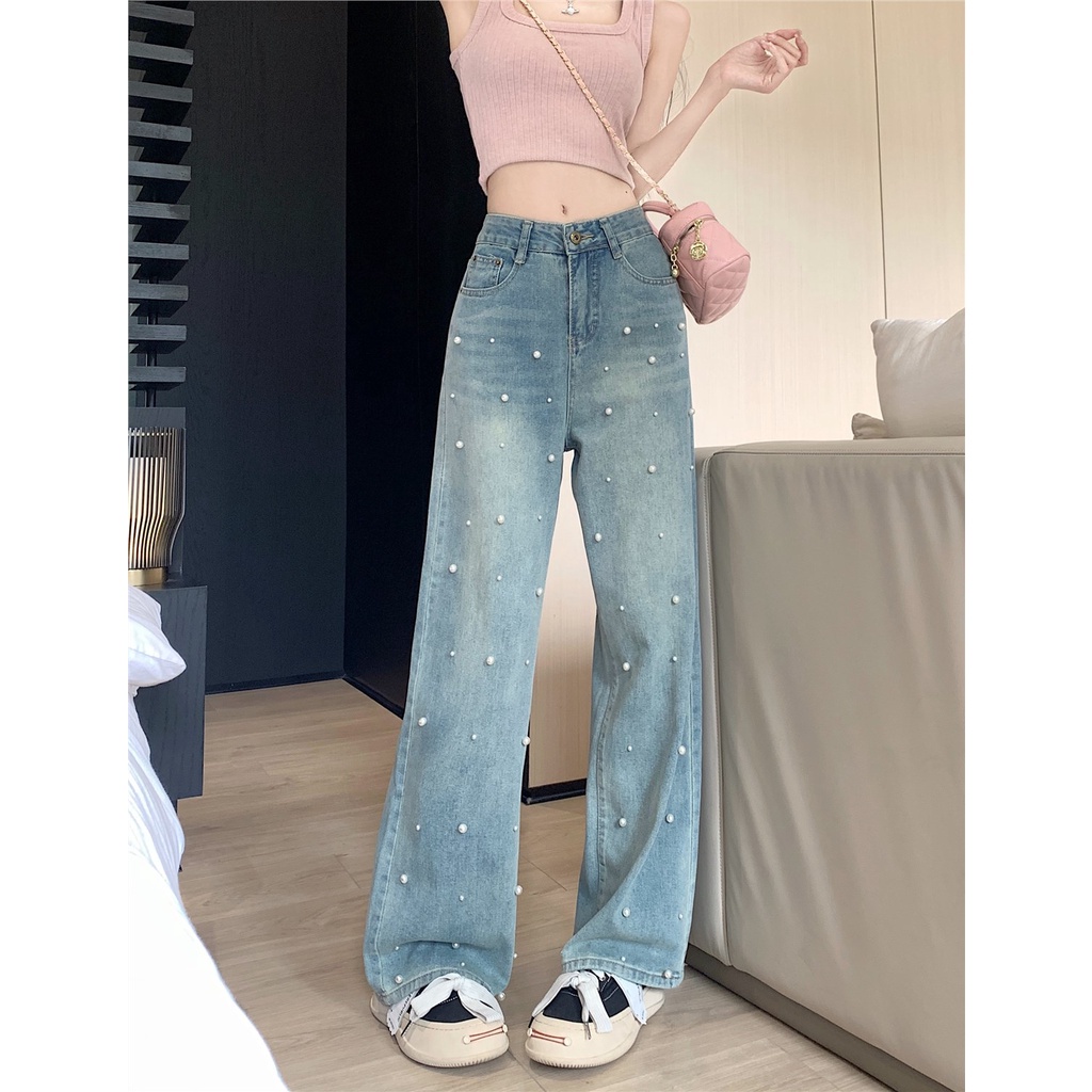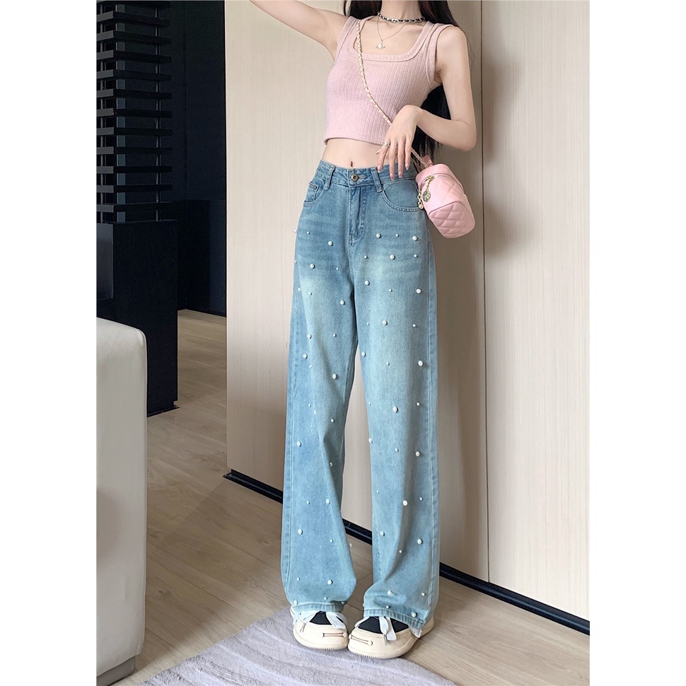 Retro industri berat mutiara jeans lurus wanita musim panas sempit versi all-match rasa desain ceruk celana lebar kaki celana