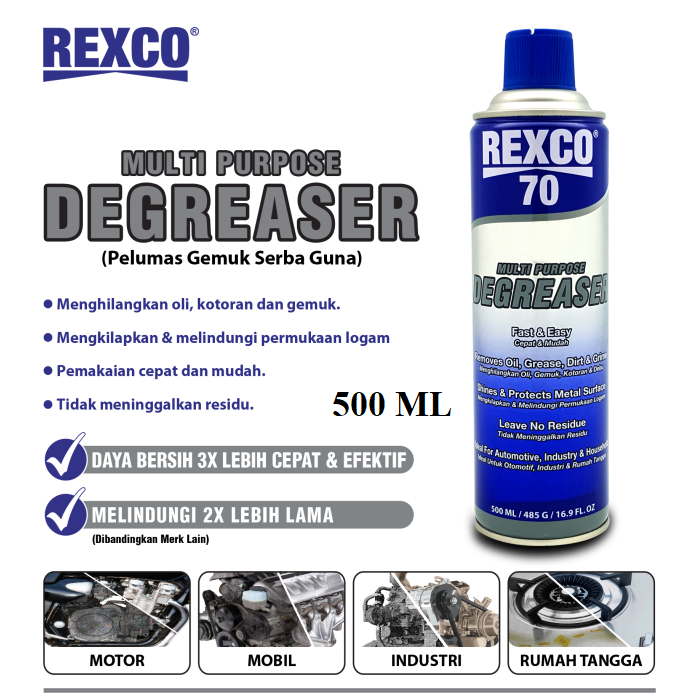 Rexco 70 Multipurpose Degreaser 500 Ml / Pembersih Grease Mesin Gemuk Degreaser Oli 70 500 ML Spesifikasi Merk : Rexco 70 Multi Purpose Degreaser Berfungsu melarutkan sekaligus mengangkat kotoran yang menempel pada permukaan benda keras. Juga mengandung anti karat dan tidak mudah terbakar. Unique selling point : Daya bersih 3x lebih cepat &efektif. Melindungi 2x lebih lama Rexco multi purpose degreaser rexco 70 Adalah pembersih gemuk serbaguna yang mempunyai cara kerja spesifik. Yaitu melarutkan sekaligus mangangkat kotoran yang menempel pada permukaan benda keras seperti logam. Cairan ini juga dapat menghilangkan oli, kotoran , dan tidak meninggalkan residu. dengan daya 3x lebih cepat dan efektif. melindungi 2x lebih lama dari merk lain, Cairan ini cocok untuk di gunakan pada perawatan mobil, motor , industri serta peralatan rumah tangga