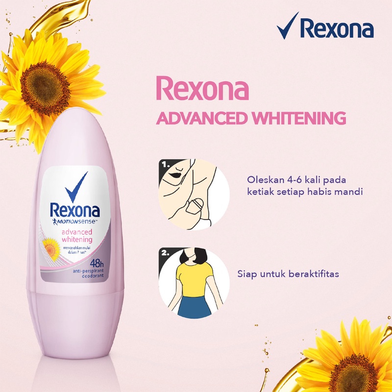 Rexona Women Anti-Perspirant Deodorant Roll On Advanced Whitening 45ml - mencerahkan kulit ketiak - melembutkan kulit - mencegah bau badan - Memberikan keharuman lembut yang menyejukkan dan memberikan perlindungan agar tetap segar sepanjang hari - Wangi segar seketika sekali semprot untuk menghilangkan bau badan BPOM: NA40160900146 Shelf life: 900 days