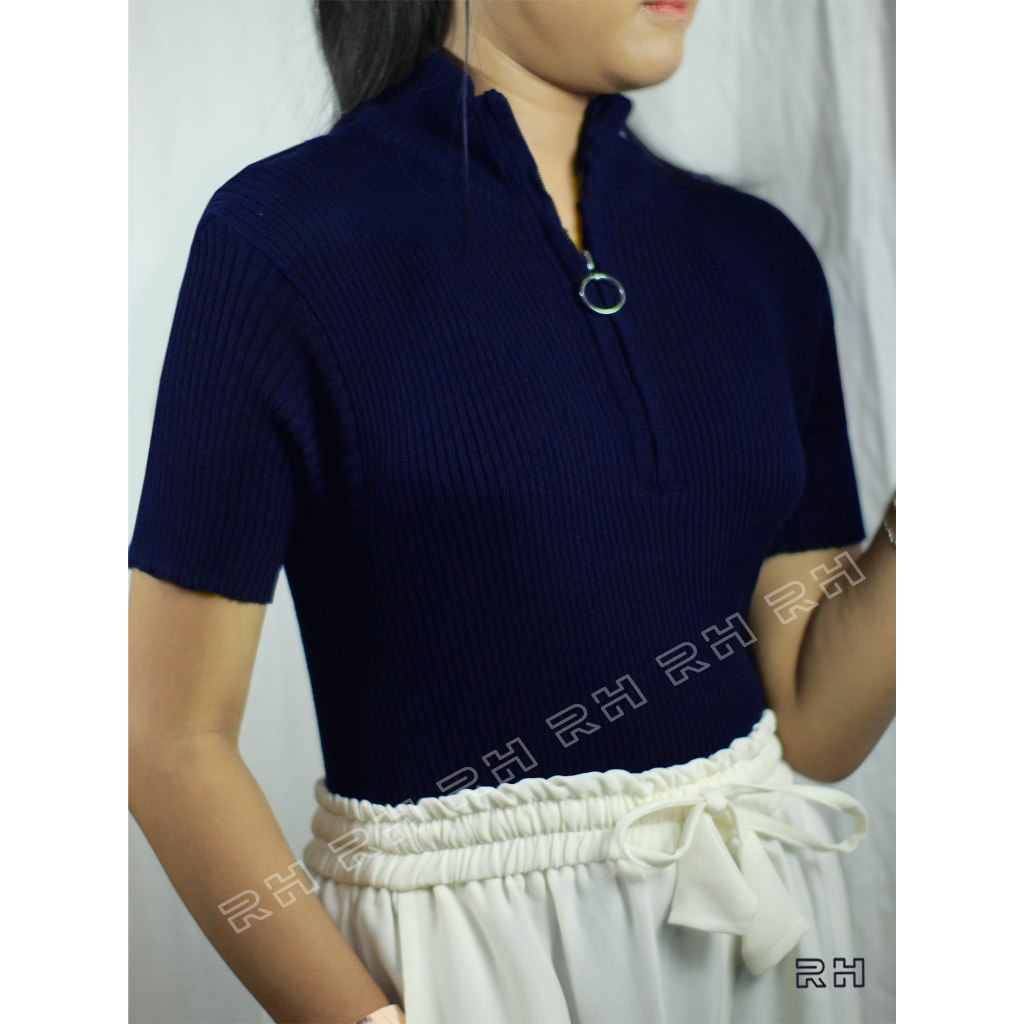 Detail RH - baju rajut wanita turtleneck resleting zipper salur sweater tangan pendek