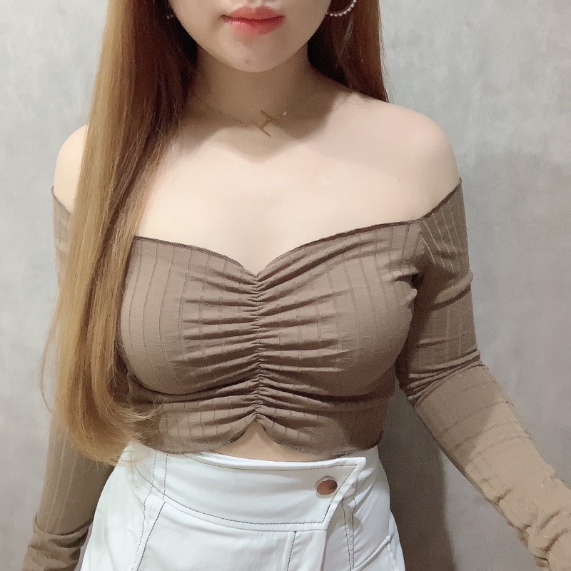 Detail Rib Off Shoulder Long Sleeve Crop Top | Sabrina Lengan Panjang Korean Fashion | Maimon Grosir