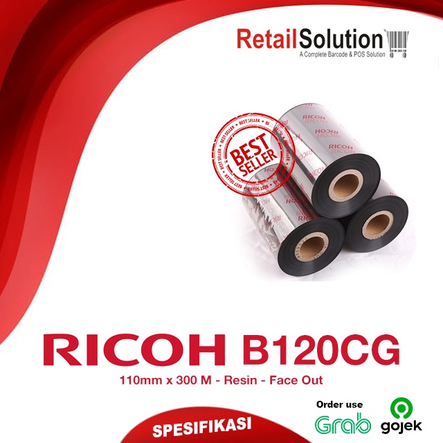 Spesifikasi : Model B120CG Tipe Full Resin Lebar 110mm Isi 300 Meter Face Out Warna Hitam Core 1-inch