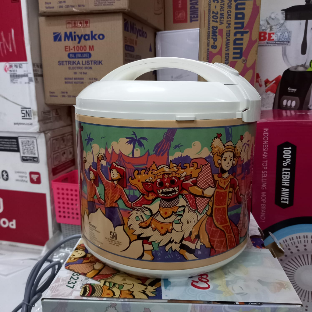 Rice Cooker Cosmos dengan panci anti lengket yang dapat digunakan untuk memasak, menghangatkan serta mengukus. Rice cooker ini sangat hemat listrik karena menghangatkan hanya 45 watt saja. Rice Cooker dengan Inner Pan Anti Lengket Kapasitas 2 Liter Low Watt Menghangatkan Hanya 45 Watt Fungsi 3in1: Memasak Menghangatkan Design Elegan