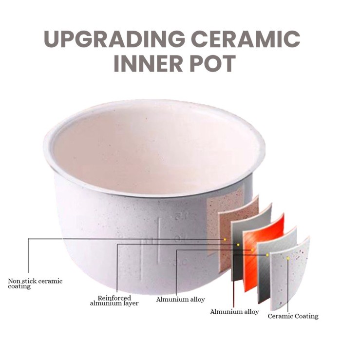 Spesifikasi: ❣ Kapasitas 3L (1.2L beras) 500W 🌟 NEW INNER POT CERAMIC COATING ( anti lengket ) 🌟Steamer bowl s/s 304 ❣ Keep Warm 40W 👆Teknologi terbaru IMD Digital Touch Screen Panel ♨ Multicooker 10 pilihan menu termasuk slow cooker, soup, kue dan yoghurt ⏱ Timer 24 jam