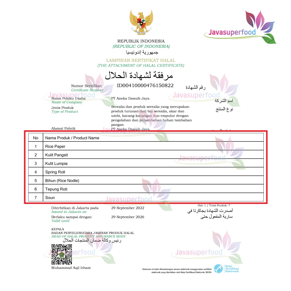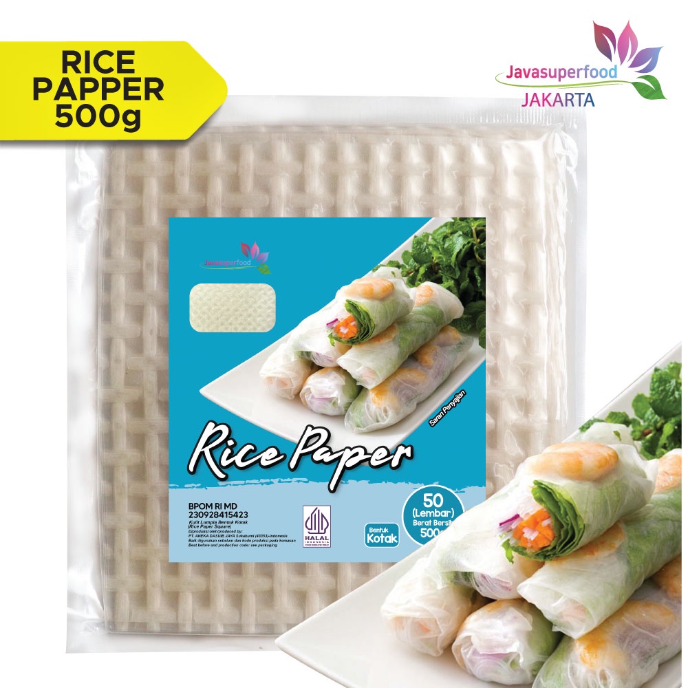 Rice paper dari Javasuperfood, Rice Paper berukuran 22cm. Sejenis kulit lumpia yang Dibuat dari tepung beras. Rice paper digunakan setelah dicelupkan/diolesi dengan air matang hingga lembek. Rice paper dapat dibuat menjadi spring roll dengan isian sayuran segar, ayam, udang, ikan, atau daging. Atau bisa juga dibuat menjadi spring roll dengan isian manis, seperti buah segar, kacang-kacangan, dengan saus selai buah, madu, atau yoghurt.