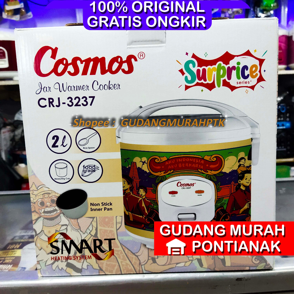 Rice Cooker Cosmos dengan innerpan nonstick coating (anti lengket), berkapasitas besar 2 Liter. Fungsi dapat digunakan untuk memasak dan menghangatkan. Desain elegan lemon dan warna lime yellow. "(1) Innerpan anti lengket, kapasitas 2 Liter (2) Fungsi memasak dan menghangatkan (3) Design Lemon Series (4) Pelengkap : gelas ukur & sendok nasi (5) Daya Masukan 400 Watt"