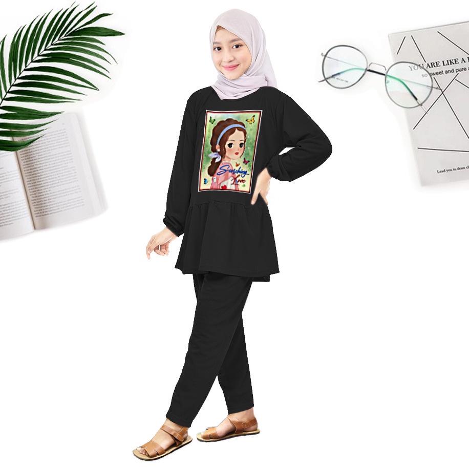 Detail RILLO - Setelan Anak Perempuan Ruffle Lengan Panjang Motif Love Usia 6-12 tahun