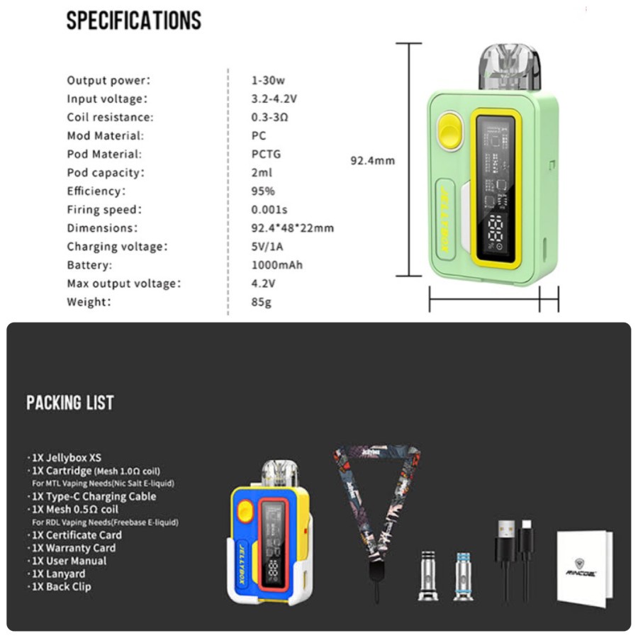 Packing list: 1 x Jellybox XS 1 x Cartridge (Mesh Jellybox Nano 1.0? coil)--For MTL Vaping Needs(Nic Salt E-liquid) 1 x Type-C Charging Cable 1 x Mesh Jellybox Nano 0.5? coil--For RDL Vaping Needs(Freebase E-liquid) 1 x Certificate Card 1 x Warranty Card 1 x User Manual 1 x Lanyard 1 x Back Clip