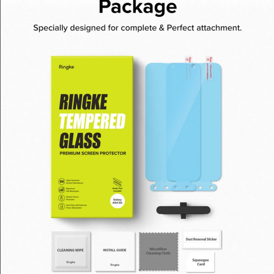 - Compatible with Galaxy A54 5G. - Premium edge-to-edge tempered glass screen protector precisely. - 9H hardness tempered glass protects the touchscreen from scratches and scuffs - Edge-smoothing technology naturally integrates the screen protector to the device without sharp borders - Full adhesive design from top to bottom for easy, long-lasting installation without bubbles and lift - Case-friendly design. Complete your protection by pairing with a Ringke case for a guaranteed fit!