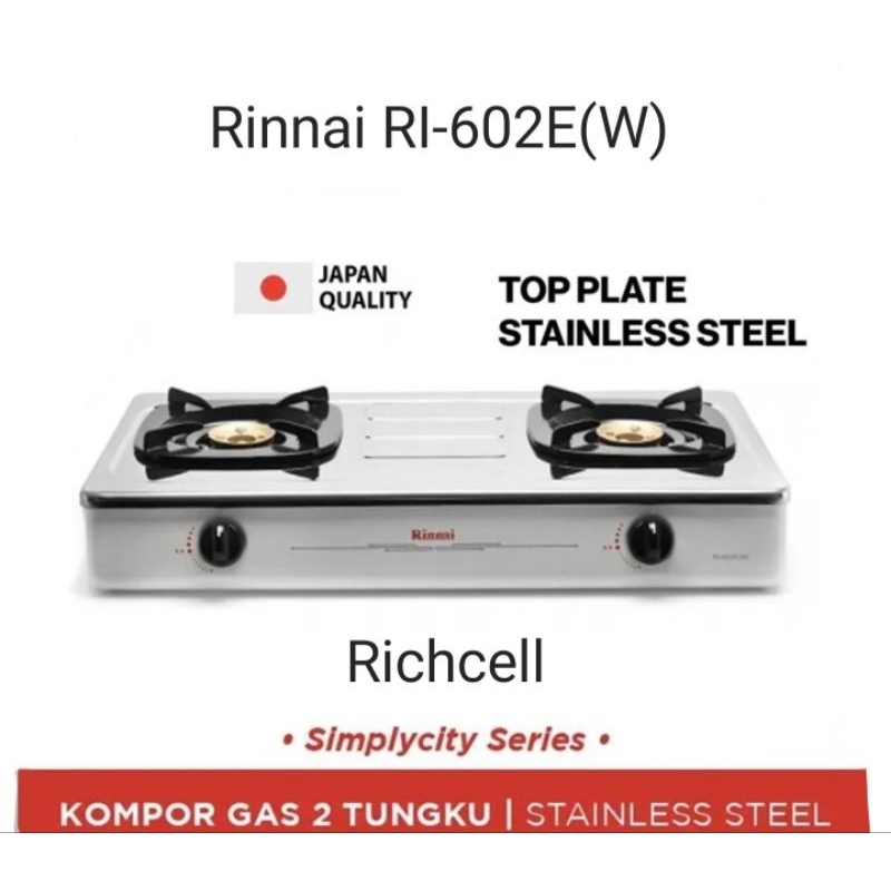 DESKRIPSI PRODUK : Rinnai Kompor Gas 2 Tungku - RI602E dirancang khusus dengan hasil api yang ekonomis sehingga dapat menghemat bahan bakar gas. Memasak di setiap hari kian leluasa tanpa was-was jika gas cepat habis. Adapun top plate yang terbuat dari bahan stainless steel menjadikan kompor bersifat anti karat serta mudah dibersihkan. Rinnai Kompor Gas 2 Tungku RI602E menjadikan memasak jadi lebih cepat dan efisien. Skala besar kecilnya api ekonomis bisa diatur sesuai tingkat kebutuhan. Dilengkapi dengan bagian top plate kompor dari Stainless Steel membuat pembersihan kian mudah.