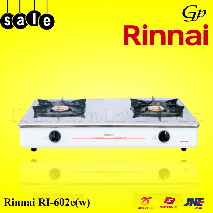 Kompor Gas Rinnai RI-602E (W) Merupakan kompor gas 2 tungku berkualitas tinggi. Dengan kompor 2 tungku, Anda dapat menghemat waktu karena memungkinkan memasak dua masakan sekaligus dan dapat mengatur besar kecilnya api sesuai kebutuhan memasak Anda. Memiliki warna putih dan berbahan stainless steel membuat dapur Anda terlihat lebih modern, cocok untuk Anda yang memperhatikan keindahan dapur Anda. Kompor ini juga mudah dibersihkan, apabila masakan memercik ke kompor. Memilik api ekonomis, teknologi ini menghasilkan kekuatan api besar yang merata sehingga menghasilkan masakan yang matang sempurna dengan konsumsi gas yang hemat. Tungku terbuat dari stainless steel dengan kualitas terbaik, pipa gas juga dilapisi cat khusus yang tahan karat. Tatakannya pun kuat dilapisi bahan enamel yang tahan panas. Kenop-nya pun terbuat dari plastik khusus yang tidak mudah retak. Terdapat juga klep pengatur udara untuk meningkatkan kualitas api.