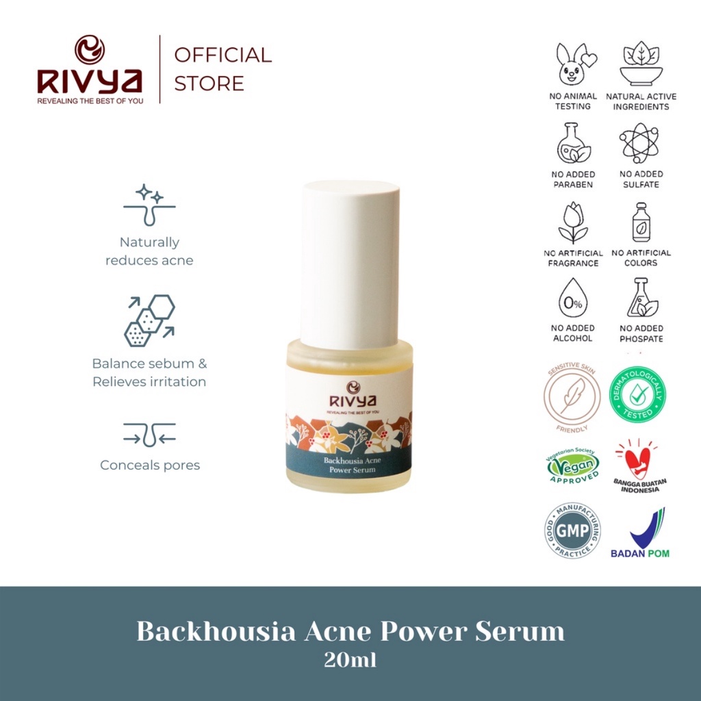 RIVYA Backhousia Acne Power Serum diformulasikan dengan 5 bahan aktif alami untuk merawat kulit berjerawat, menenangkan kulit kemerahan akibat jerawat, menyamarkan pori-pori dan membantu mengontrol dan mengatur produksi sebum berlebih pada wajah sehingga kulit wajah tampak sehat.