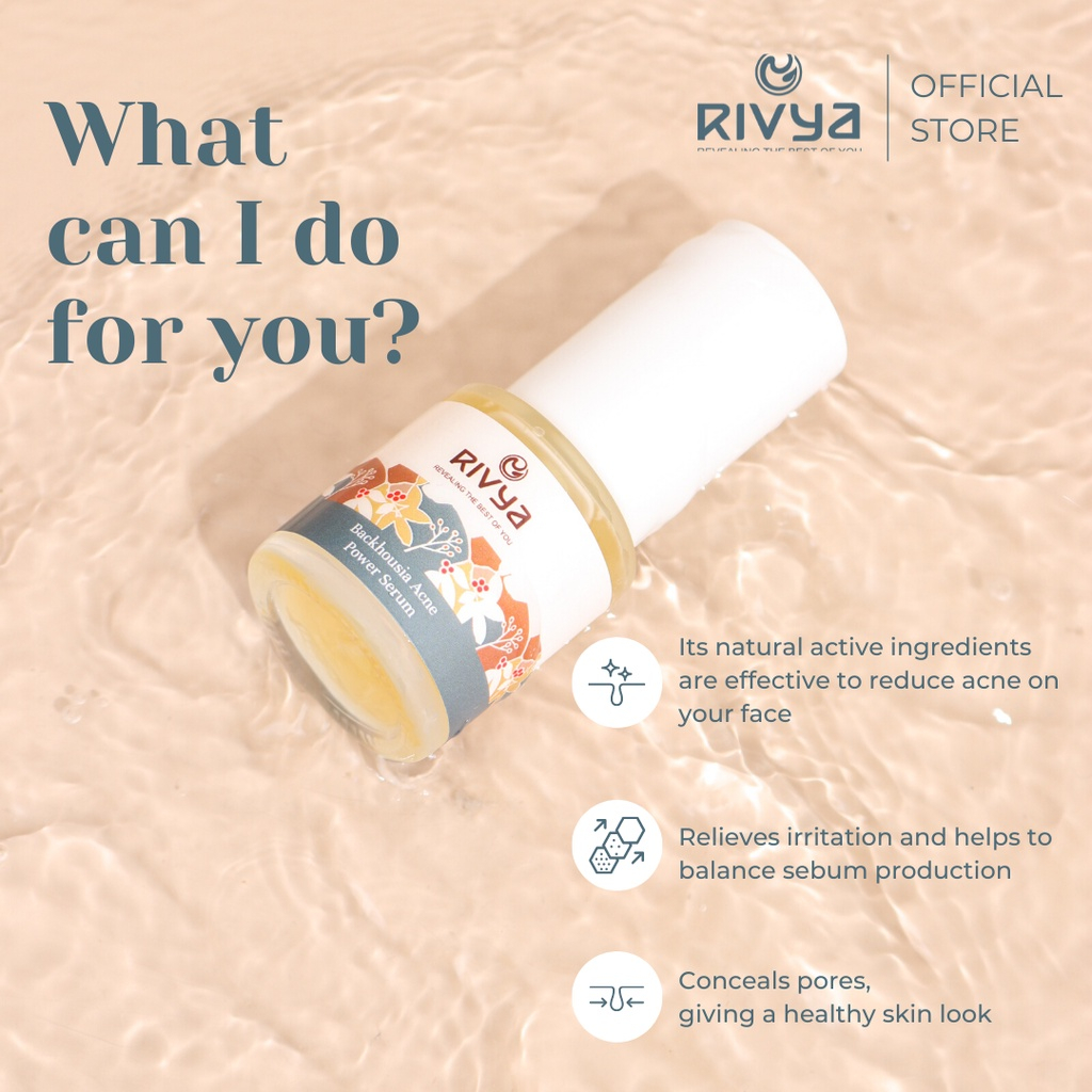 RIVYA Backhousia Acne Power Serum diformulasikan dengan 5 bahan aktif alami untuk merawat kulit berjerawat, menenangkan kulit kemerahan akibat jerawat, menyamarkan pori-pori dan membantu mengontrol dan mengatur produksi sebum berlebih pada wajah sehingga kulit wajah tampak sehat.