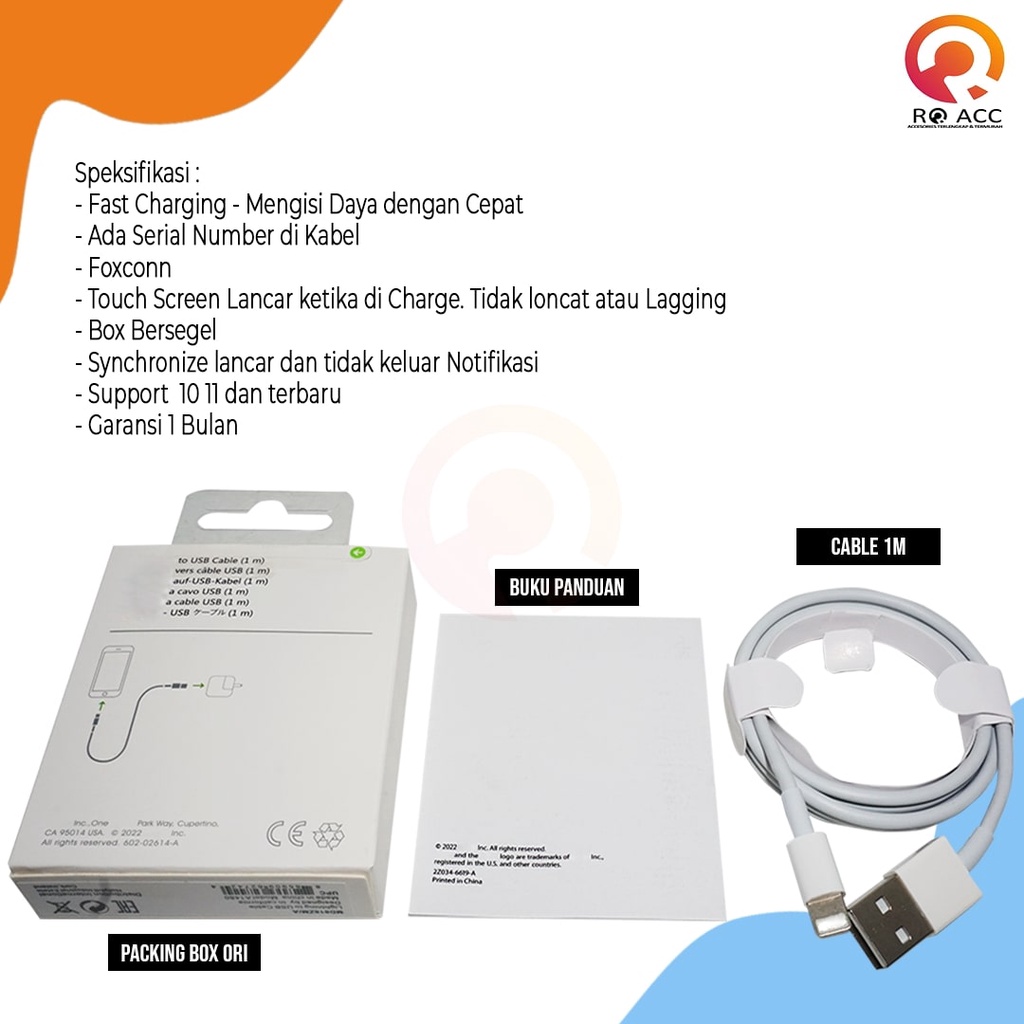 SPEKSIFIKASI - Fast Charging - Mengisi daya dengan cepat - Ada serial number di kabel. - Touch screen lancar ketika di charge. Tidak loncat atau lagging - Box bersegel - Synchronize lancar dan tidak keluar notifikasi - Support iOS 10, 11 dan iOS terbaru - GARANSI 1 BULAN