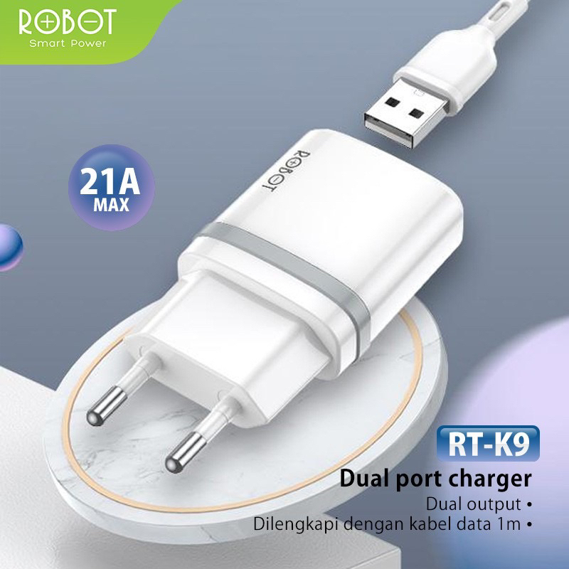 Keunggulan: ROBOT RT-K9 12W Dual Port 2.1A with 1M Micro Data Cable Multiple Smart Protection Power Charger BARU DAN ORIGINAL 100% GARANSI 1 TAHUN RESMI ROBOT INDONESIA