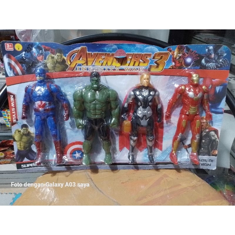 Deskripsi Produk Mainan miniatur superhero... Tinggi sekitar 15cm lebar sekitar 10 cm isi 4 super hero Bahan plastik