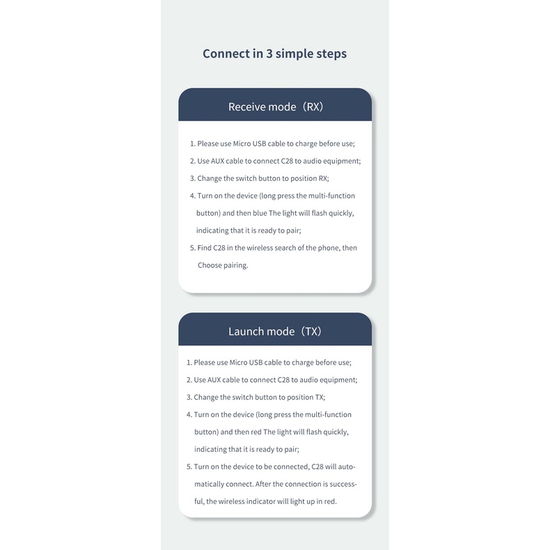 1 x Robotsky Bluetooth Audio Receiver Transmitter Adapter 2 in 1 - C28 1 x Kabel Pengisian Daya 1 x Kepala Audio 3.5 mm 1 x Panduan Penggunaan Spesifikasi Material Plastik Dimensi 60 x 22 x 11 mm Lain-lain Kapasitas Baterai: 140 mAh Waktu Pengisian Daya: 1 Jam Waktu Penggunaan: 4 Jam Antarmuka: AUX Tingkat Transmisi: 5 Mbps Jarak Efektif Penggunaan: 10 Meter Frekuensi: 2.4 MHz Bluetooth 5.0