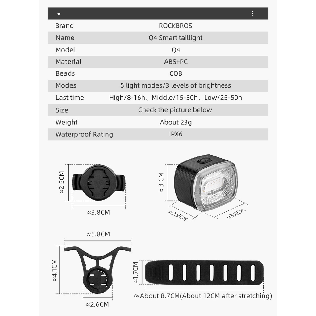 ➤ Brand: Rockbros ➤ Model: Q4 ➤ Tipe: Bike Smart Tail Light - Brake Sensor ➤ Material: ABS+PC ➤ Beads: COB ➤ Modes: 5 light modes ➤ 3 level of brightness ➤ Last time: High/8-16h,Middle/15-30h,Low/25-50h ➤ Weight: about 23g ➤ Waterproof rating: IPX6 ➤ Warna nyala lampu : Merah - Biru - Ungu (di 2 mode)