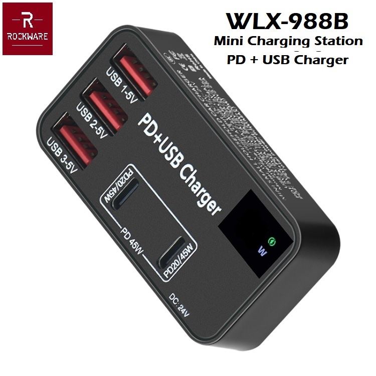 Specification Product Name: Mini Small Household USB Charger Product Model: WLX-988B Input: DC 24V Interface: 2x USB-C, 3x USB-A Output USB-C1 PD: 5V=3A/9V=3A/12V=2.5A/15V=3A/20V=2.25A (45W MAX) Output USB-C2 PD: 5V=3A/9V=2.22A/12V=1.67A (20W MAX) Output USB-A1/A2/A3: 5V/1A~2.4A (Max 5V/4A) Output PD1 + PD2: 20W + 20W Total Power: 48W MAX