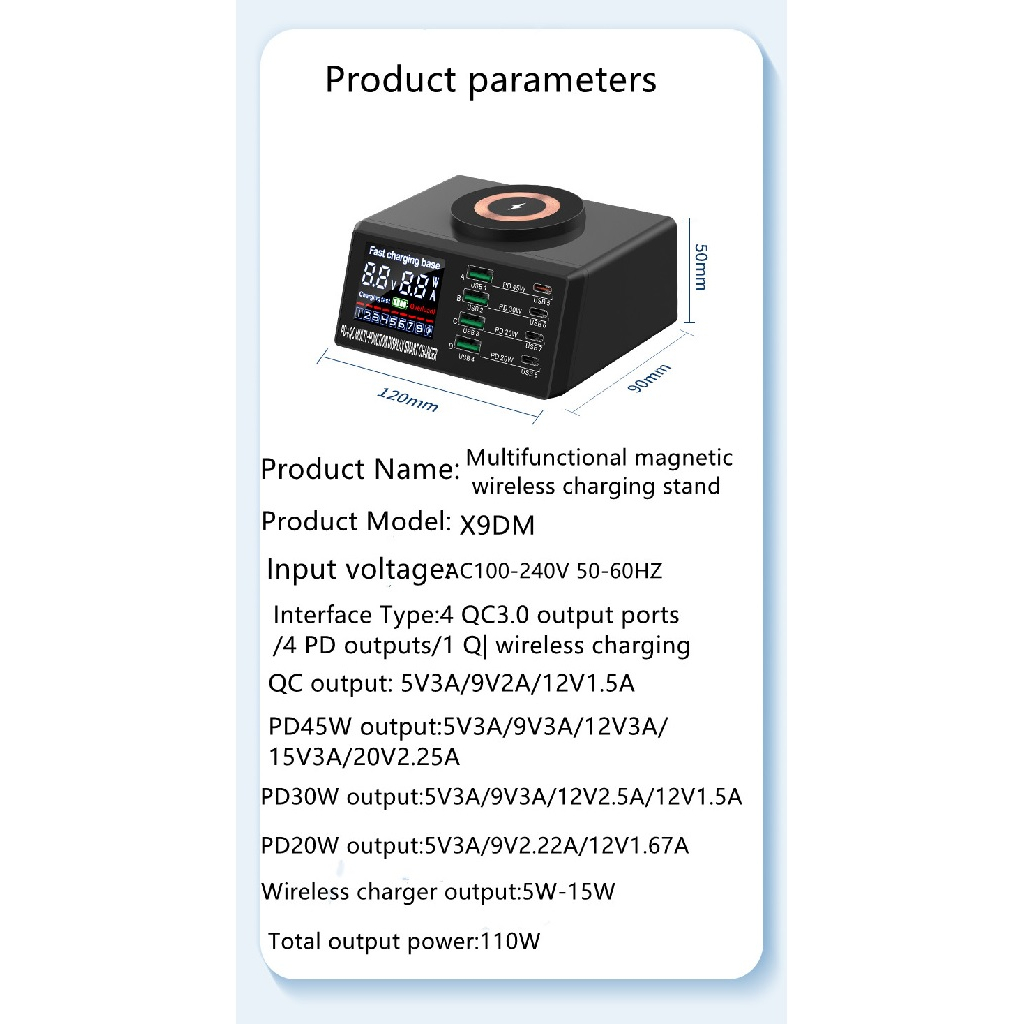 Ini adalah pengisi daya USB dengan jumlah USB port sebanyak 8 port, yakni 4 USB Type-C port dan 4 USB-A port sebuah Wireless Charger sehingga anda dapat mengisi daya maksimal 9 perangkat/gadget anda sekaligus.