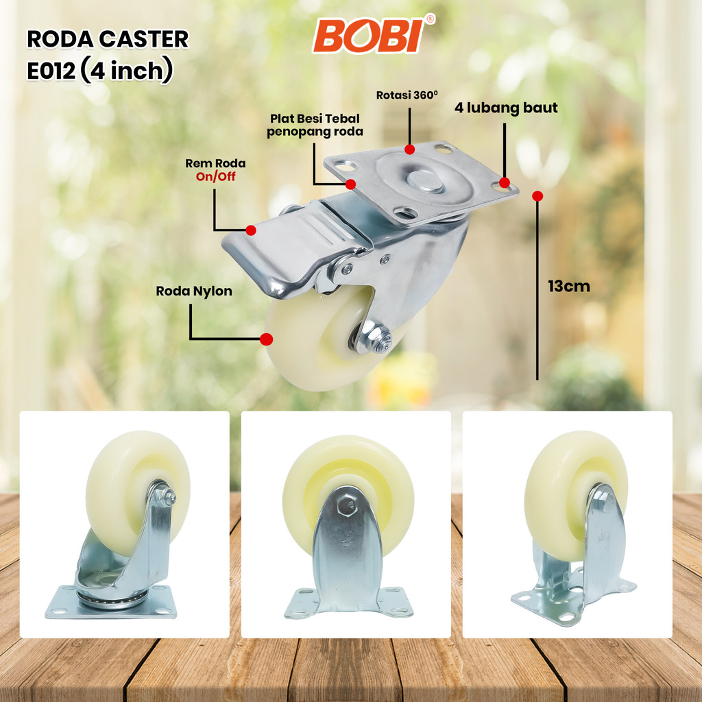 Roda Caster PVC NYLON // Roda Etalase Lemari 4 inch // Roda Serbaguna BOBI Kegunaan roda ini untuk kereta belanja , kursi kantor , etalase tempat makan, tempat tidur rumah sakit, dan peralatan penanganan bahan . dll. Ketahan yang sangat baik terhadap panas, bahan kimia, korosi dan usia pemakaian yang cukup awet. Bahan yang cukup ringan.