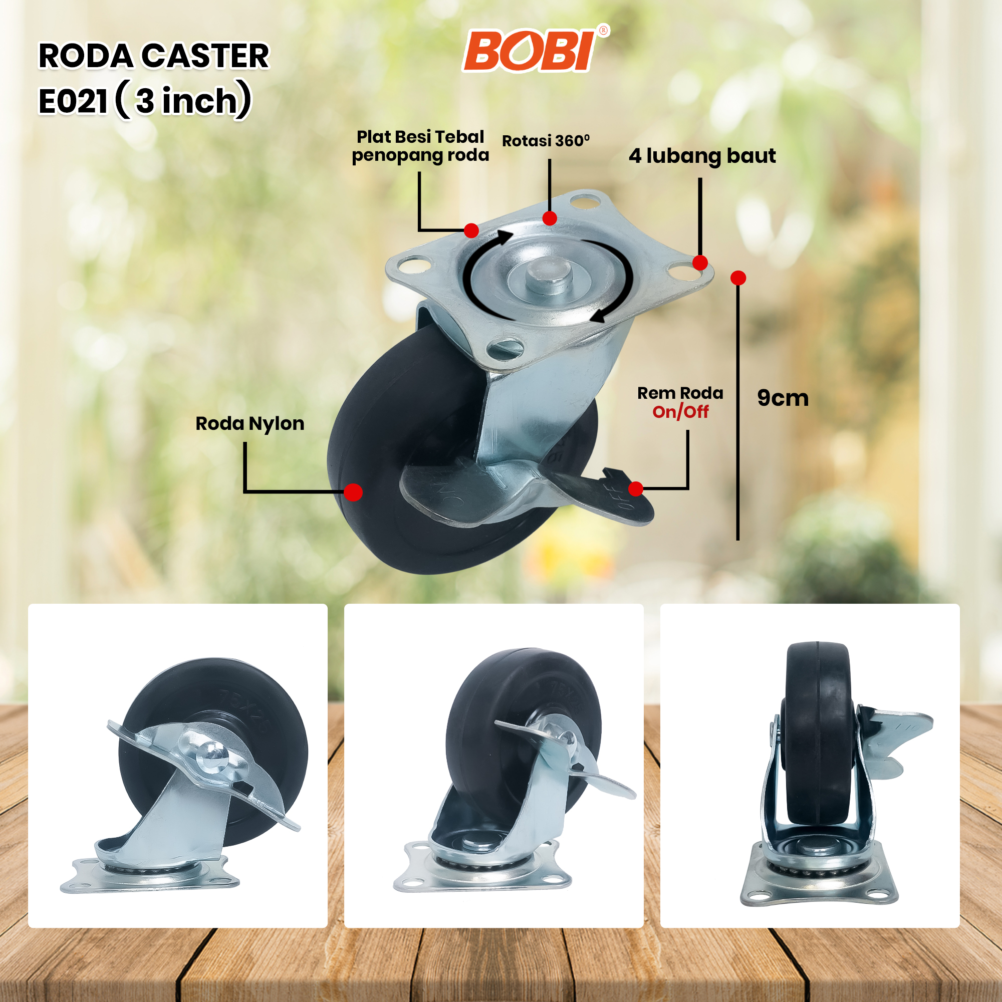 Roda Caster PVC NYLON // Roda Etalase Lemari 3 inch // Roda Serbaguna BOBI Kegunaan roda ini untuk kereta belanja , kursi kantor , etalase tempat makan, tempat tidur rumah sakit, dan peralatan penanganan bahan . dll. Ketahan yang sangat baik terhadap panas, bahan kimia, korosi dan usia pemakaian yang cukup awet. Bahan yang cukup ringan.