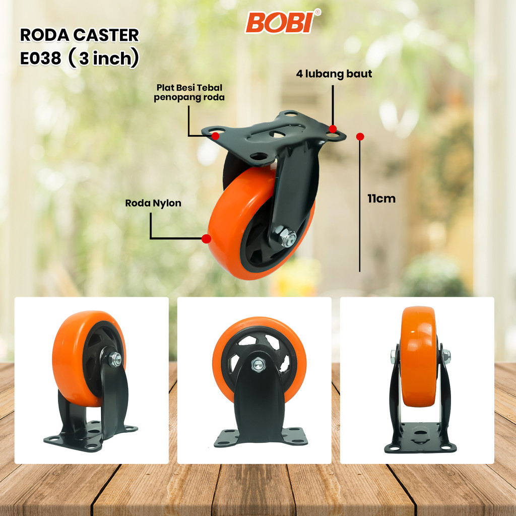Roda Caster PVC NYLON // Roda Etalase Lemari 3 & 4 inch // Roda Serbaguna BOBI Kegunaan roda ini untuk kereta belanja , kursi kantor , etalase tempat makan, tempat tidur rumah sakit, dan peralatan penanganan bahan . dll. Ketahan yang sangat baik terhadap panas, bahan kimia, korosi dan usia pemakaian yang cukup awet. Bahan yang cukup ringan.