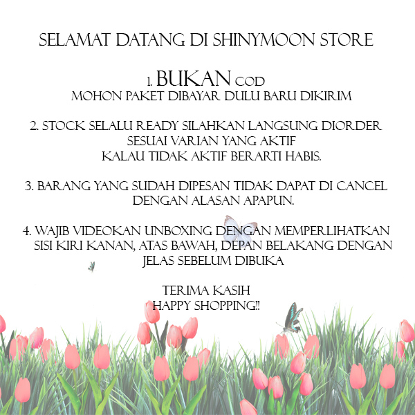 Selamat datang di Shinymoon Store Mohon perhatiannya: 1. Tidak ada COD. 2. Stock selalu ready, silahkan langsung diorder sesuai varian yang aktif, kalau tidak aktif berarti barang habis. 3. Barang yang sudah dipesan tidak dapat dicancel dengan alasan apapun. Pastikan pesanan sudah benar sebelum check out. 4. Wajib videokan unboxing dengan memperlihatkan sisi kiri kanan, atas bawah, depan belakang dengan jelas sebelum dibuka. 5. Mohon konfirmasi penerimaan barang jika barang sudah sampai, agar uang seller tidak tertahan lama dan bisa segera restock kembali. 6. Pemesanan sebelum jam 3 sore dikirim hari ini, kalau setelah jam 3 sore dikirim keesokan harinya. Karena kurirnya biasa datang antara jam 3-4sore. 7. Membeli berarti setuju dengan deskripsi yang tertulis. 8. Jangan lupa follow toko kami untuk update koleksi terbaru.