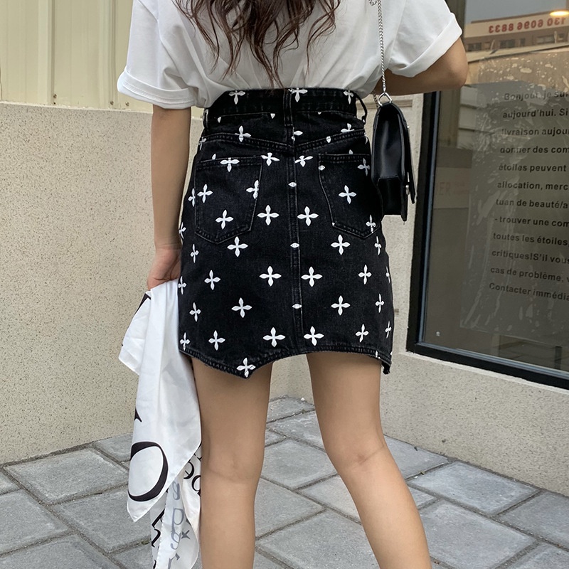 Nama: Rok Cross Cetak Wanita Desain Baru A-Line Skirt Denim Rok Bawahan Tidak Teraktur