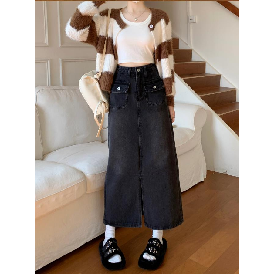 Detail Rok Denim Wanita Korean Style Rok Jeans panjang Premium Vintage A-line Skirt Highwaist Rok Jeans