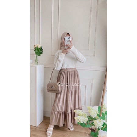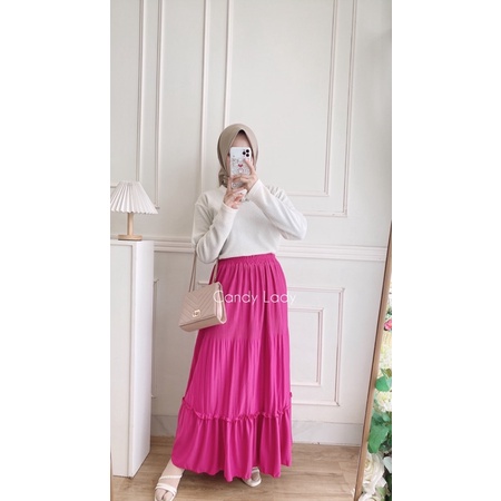 Bahan hyget. Bahan adem , sedikit bertekstur dan nyaman dipakainya. Plisket rapih. Ada aksen ruffle bagian bawah. Bagian pinggang full karet yang kokoh.