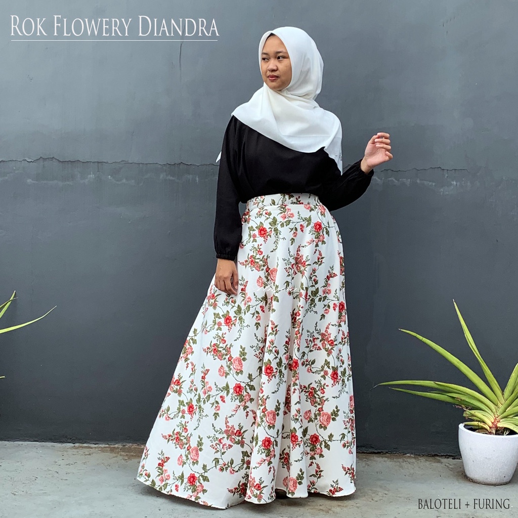 Detail Rok Panjang Wanita Payung Muslimah Motif Bunga Flowery Diandra Umbrella Skirt Rok Maxi Rok Flare