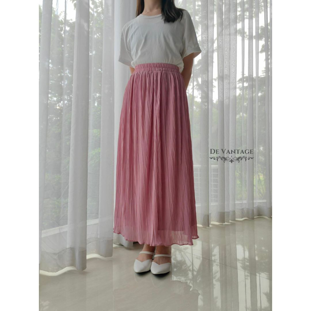 > Rok plisket polos dengan detail tekstur > Terdapat 2 lapisan sehingga tidak nerawang > Lapisan furing panjang sampai mata kaki > Karet pinggang elastis, bisa melar sampai 44 cm > Bahan import ringan dan flowy, sangat nyaman dipakai