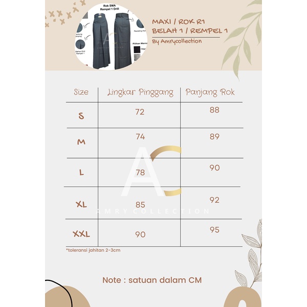 Bahan : TWIST / Element Kain Licin Tidak mudah kusut Tekstur kain jatuh Tebal, tidak tipis. Model : Span 1 / belah 1 • Slim fit • Ada saku disamping • Pinggang non karet / tidak pakai karet Warna : • Abu-abu • Hitam • Coklat • Putih • Biru Detail size : • Lp (Lingkar pinggang • Pr (panjang rok) • Satuan dalam cm (centi meter) S = Lp 75 Pr 88 Estimasi berat 38-45kg M = Lp 78 Pr 90 Estimasi berat 45-49kg L = Lp 80 Pr 92 Estimasi berat 50-57kg XL = Lp 85 Pr 95 Estimasi berat 58-65kg XXL = Lp 90 Pr 98 Estimasi berat 65-75kg *note seller : ukuran diatas menggunakan ukuran standar pada seragam sekolah, bisa di sesuaikan dengan BB dan TB masing-masing. Atau bisa sesuaikan size yang telah kami sediakan. ^^