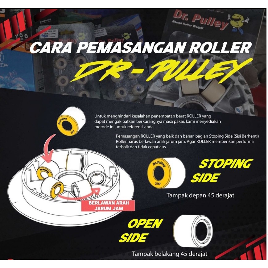 Spesifikasi & Keunggulan Roller Dr.Pulley ⭐Roller Dr.Pulley di produksi Oleh UNIONMATERIAL yang berasal dari Negara Taiwan dan telah memiliki paten US world wide. ⭐Meminimalis pergerakan abnormal roller pada variator. ⭐Terbuat dari bahan teflon self lubricant dengan kode SL9T yang mengandung pelumas, sehingga ketika terkena gesekan akan lebih enteng dan jauh lebih awet. ⭐Meningkatkan performa motor dari segi torsi untuk memaksimalkan TOP SPEED motor matic. ⭐Roller yang terpasang pada variator / rumah rolller / pulley memiliki ukuran dan berat tertentu untuk mengatur performa torsi / tarikan dan seberapa cepat topspeed bisa dicapai pada motor matic.