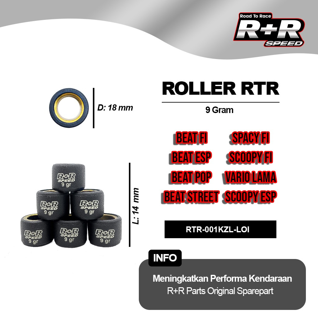Ukuran ROLLER RACING yang berkode RTR-RL01KZL-LOI : Diameter : 18mm Lebar : 14mm Berat Roller : 6 Gram sampai 17Gram (Tergantung Jenis Motor)