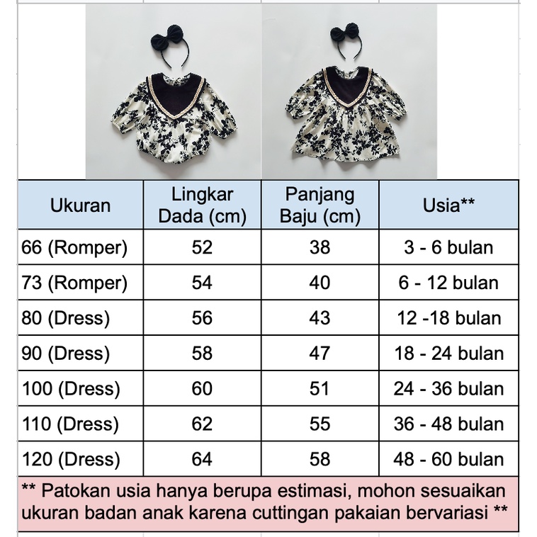 📌Detail ukuran : Romper : - 66 (3-6 bln) Ld: 52cm, Panjang Dress : 38cm - 73 (6-12 bln) Ld: 54cm, Panjang Dress : 40cm Dress : - 80 (12-18 bln) Ld: 56cm, Panjang Dress : 45cm - 90 (18-24 bln) Ld: 58cm, Panjang Dress : 47cm - 100 (24-36 bln) Ld: 60cm, Panjang Dress : 51cm - 110 (36-48 bln) Ld: 62cm, Panjang Dress : 55cm - 120 (48-60 bln) Ld: 64cm, Panjang Dress : 58cm