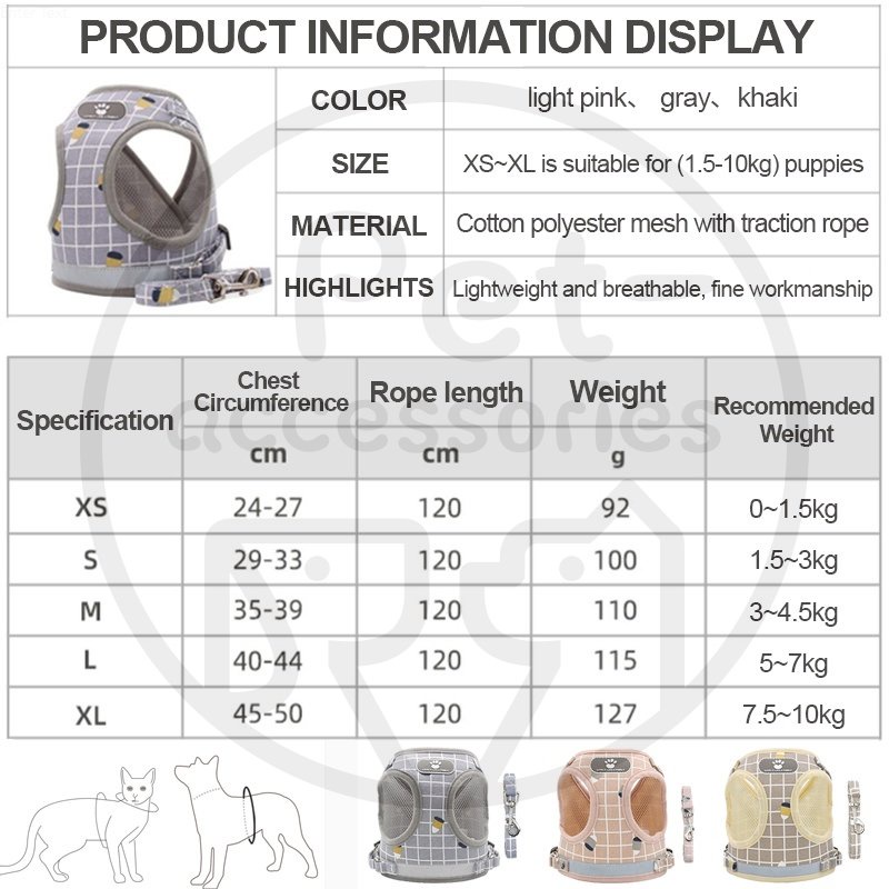 Ukuran: S: Dada: 29-33cm; cocok untuk berat antara 1.5-2.5KG, Panjang Tali: 120cm M: Dada: 35-39cm; cocok untuk berat antara 3-4.5KG, Panjang Tali: 120cm L: Dada: 40-44cm; cocok untuk berat antara 4,5-7KG, Panjang Tali: 120cm XL: Dada: 45-50cm; cocok untuk berat antara 7,5-10KG, Panjang Tali: 120cm