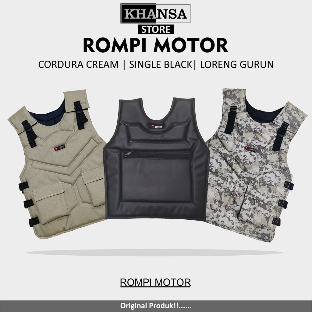 Rompi Motor Bozman merupakan rompi motor berkualitas dengan harga bersaing yang selalu mengedepankan kebaharuan serta kepuasan pelanggan. Spesifikasi: - Tersedia dalam 2 model yaitu model Double (pelindung body, depan belakang) dan model Single (pelindung dada, hanya bagian depan). - Bahan Cordura dan B.600 (anti air dan tidak tembus angin karena berlapis karet), busa dan puring halus. - Benang berukuran besar, sehingga lebih menjamin kekuatan jahitan. - Terdapat 2 buah saku fungsional berukuran sedang di bagian perut untuk model Double, dan 1 buah saku berukuran besar untuk model Single - All-size, di sisi kiri dan kanan rompi ada tali webbing untuk mengukur besar kecil rompi dilengkapi dengan kunci sodok. (Untuk model Single disediakan tali webbing di sisi belakang) - Desain bagian depan dan belakang minimalis namun terlihat elegan. - Khusus model Double dilengkapi dengan scotchlite di bagian belakang, sehingga lebih aman dipakai berkendara di malam hari. -Ukuran panjang x lebar Double = 41cm x 57cm Single = 41cm x 46cm - Muat untuk orang dewasa sampai dengan BB 90kg atau lingkar perut 130cm - PENTING : BUKAN SERAGAM RESMI TNI