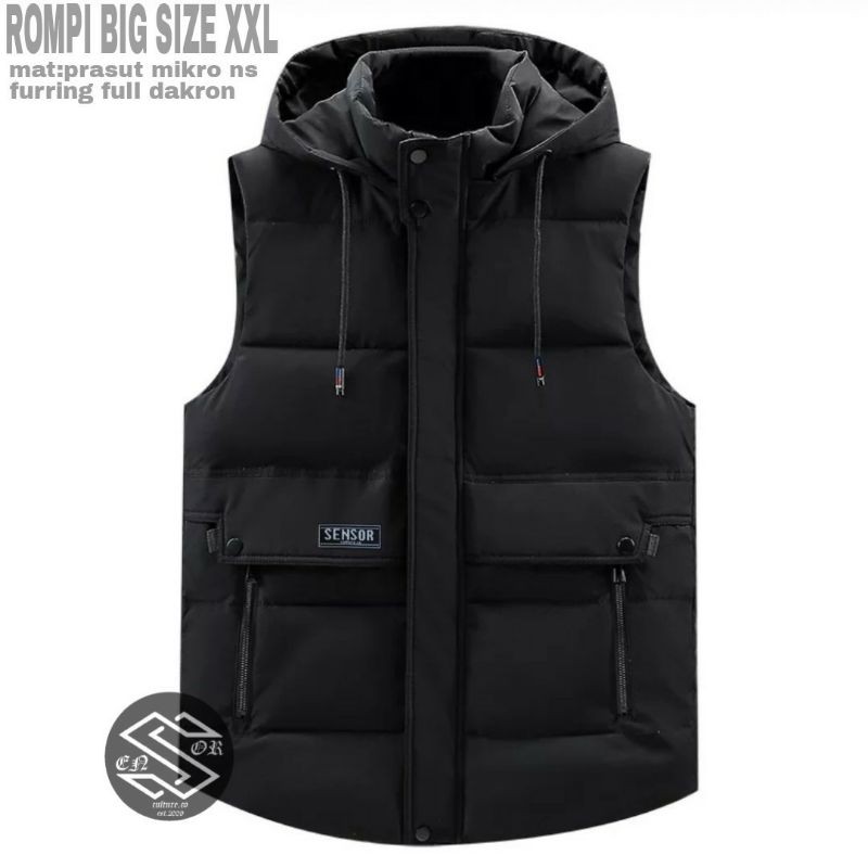 Rompi taslan pria jumbo terbaru . Brand:Sensor Bahan:Taslan premium Warna:Hitam dan abu abu Ukuran:XXL Detail lebar dada XXL.dengan lebar dada