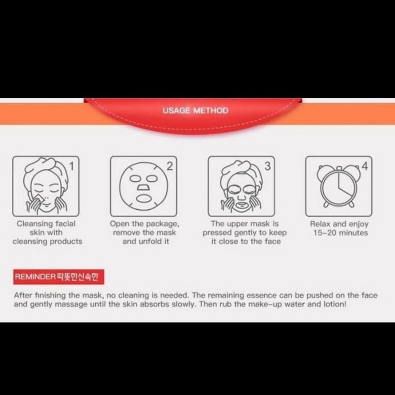 Cara Penggunaan Masker : 1. Bersihkan wajah 2. Tempelkan masker 3. Tunggu sekitar 15-30menit 4. Pijat-pijat wajah setelah penggunaan dengan essence yg masih tersisa untuk hasil maksimal