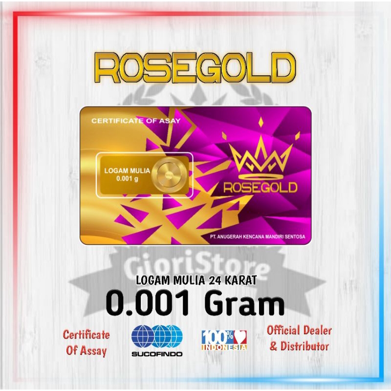 Rosegold merupakan emas 24 karat bersertifikat resmi & telah di uji di Lab Sucofindo. Rosegold terdiri dari berbagai macam ukuran mulai dari 0.001 gr, 0.002 gr, 0.005 gr, 0.01 gr, 0.02 gr, 0.05 gr dan 0.10 gr.