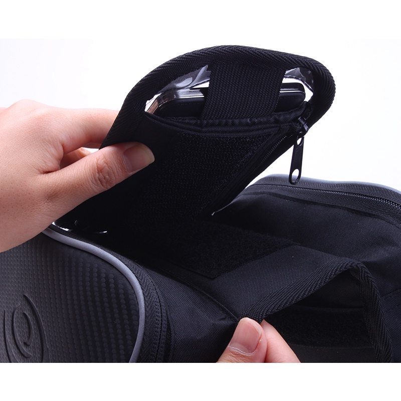 Bag anti air ini diletakkan pada bagian batang sepeda. Bag terbagi menjadi 2 buah kompartmen, kompartmen pertama untuk menaruh semua barang-barang Anda dan kompartmen kedua dirancang khusus untuk menaruh smartphone dengan ukuran maksimal 5.5 inch.