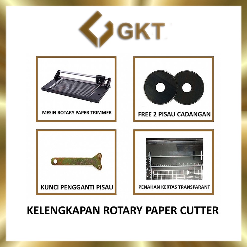 Kelengkapan : * 1 Unit Mesin Paper Trimmer Paper Cutter * Free 2 Pcs Pisau Cadangan * Free 1 Pcs Kunci Untuk Mengganti Pisau