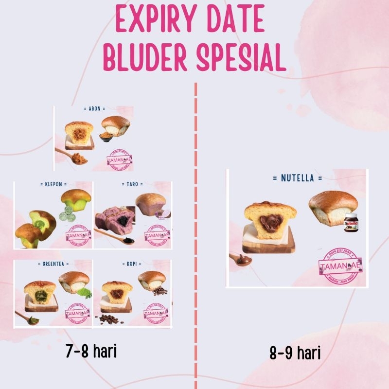 Catatan : 1. Produksi setiap hari 2. Rasa bisa pilih sesuai selera (TULIS dicatatan atau kami kirim RANDOM) 3. Bluder yg kami kirim selalu BARU / FRESH THE OVEN, produksi pada hari pengiriman ya jadi tidak usah khawatir 👍 4. Resi di update pukul 19.00 WIB jadi mohon ditunggu dulu 👍