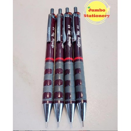 ROTRING Tikky Mechanical Pencil 0.5 mm . Pensil mekanik premium Rotring sudah terkenal dengan kualitas tinggi dan tahan lama. * Menggunakan Rotring Brass Mechanism untuk menjaga posisi batang pensil tetap presisi dan mencegah batang pensil patah. * Pegangan karet memberikan rasa nyaman saat digenggam. * Body terbuat dari plastik, ringan dan dilengkapi kode warna (ISO 3098) untuk memudahkan identifikasi ketebalan garis dari setiap pensil yang berbeda. * Terdapat penghapus di dalam ujung tutupnya.