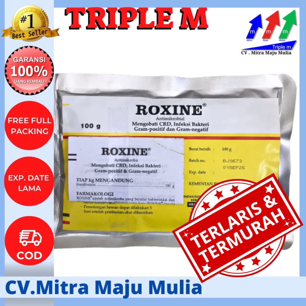 Deskripsi ROXINE*merupakan antimikroba dengan spektrum aktivitas luas. ROXINE* efektif terhadap infeksi pada saluran pemafasan, pencemaan, kemih pada unggas. ROXINE* bekerja dengan cara menghambat kerja enzim DNA-gyrase yang penting bagi proses perbanyakan bakteri. ROXINE* diindikasikan untuk mengobati CCRD, infeksi bakteri Gram-positif dan Gram-negatif, seperti yang disebabkan oleh: -Mycoplasma spp. -Bakteri Gram-positif, seperti Staphylococcus spp., Streptococcus spp., Corynebacterium pyogenes, Clostridium spp., -BakteM Gram-negatif, seperti E. coli (Colibacillosis). Haemophilus spp. (Snot/Coryza), Pasteurella spp. (Fowl Cholera), Salmonella spp. (Salmonellosis).
